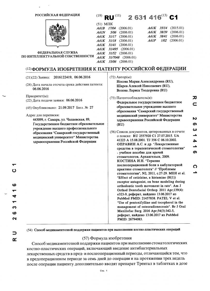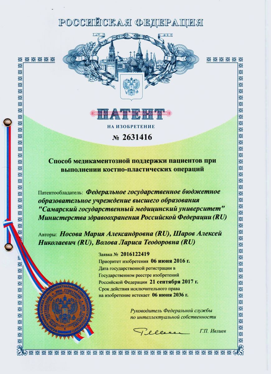 4. Патент РФ на изобретение № 2398605 «Способ лечения воспалительных осложнений при проведении хирургического лечения альвеолярных дефектов».
