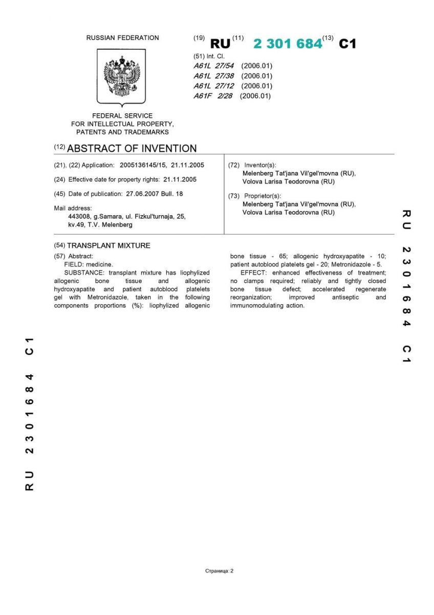 Proprietor(s): Melenberg Tat'jana Vil'gel'movna (RU), Volova Larisa Teodorovna (RU) (54) TRANSPLANT MIXTURE (57)