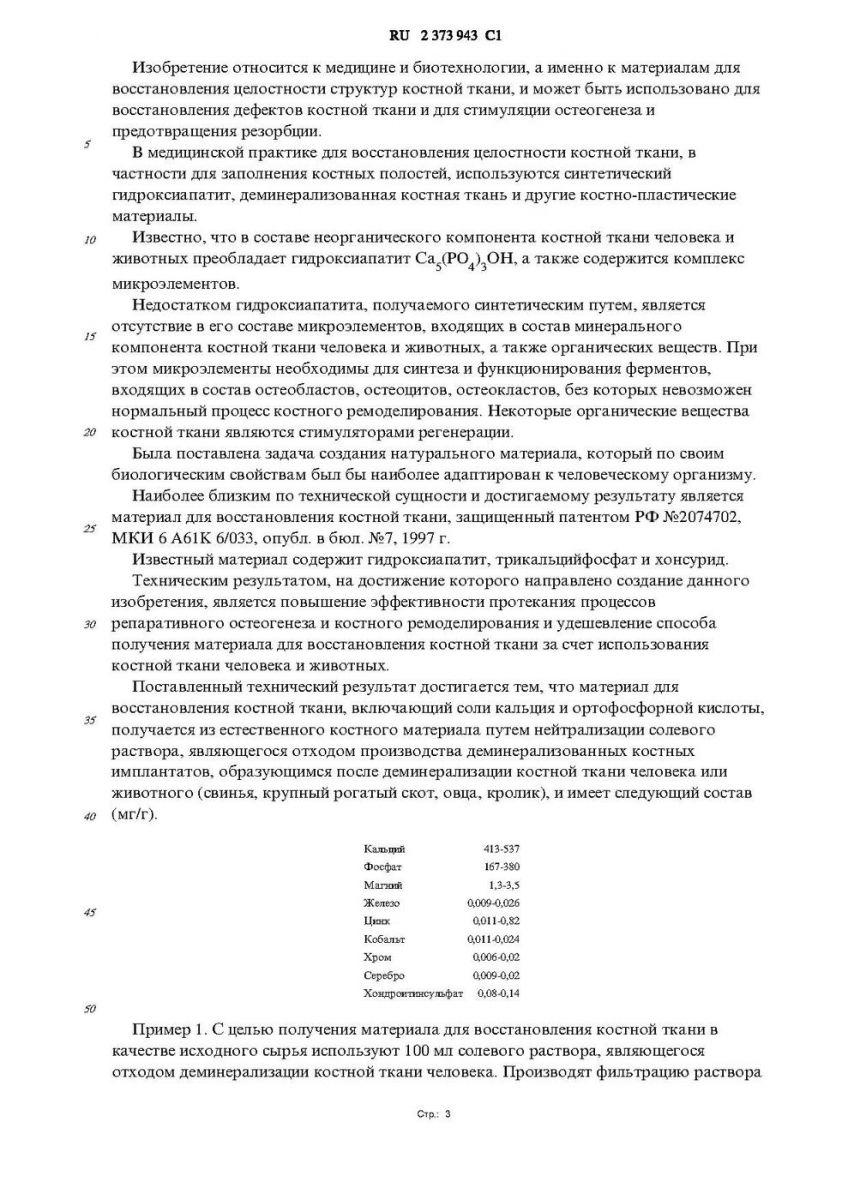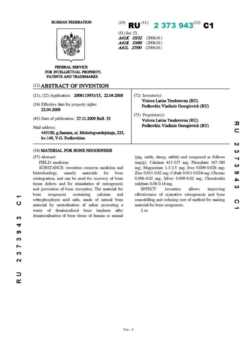 Int. Cl. A61K 35/32 (2006.01) A61K 33/00 (2006.01) A61L 27/00 (2006.01) (19) RU(11) 2 373 943(13) C1 (12) ABSTRACT OF INVENTION (21), (22)