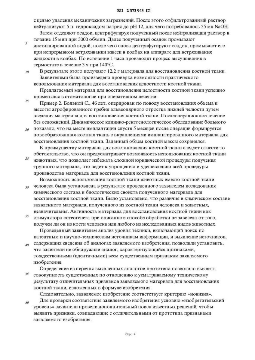 Определение из перечня выявленных аналогов прототипа позволило выявить совокупность существенных по отношению к усматриваемому техническому результату отличительных признаков заявляемого материала для восстановления костной ткани, изложенных в формуле изобретения. Следовательно, заявляемое изобретение соответствует критерию «новизна».