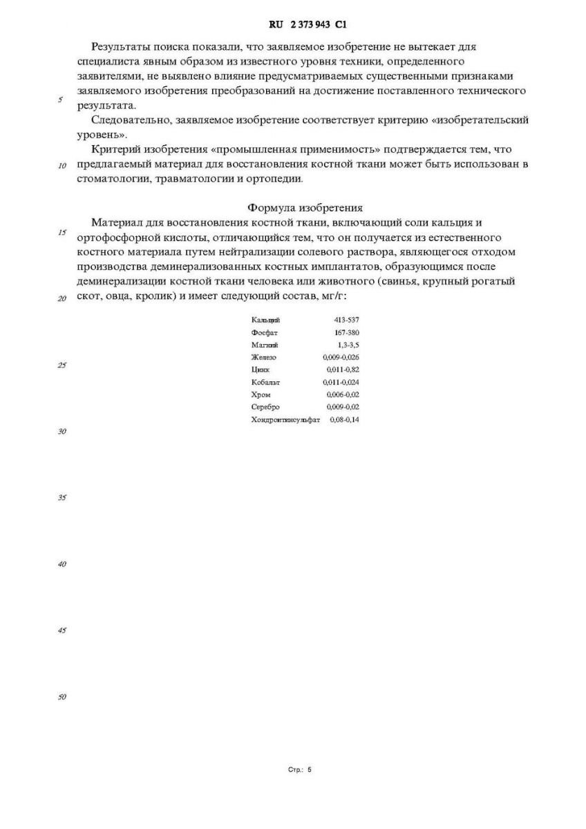 Возможность использования костной ткани животных вместо костной ткани человека была установлена в результате проведенного заявителем исследования химического состава и биологических свойств полученного материала для восстановления костной ткани.