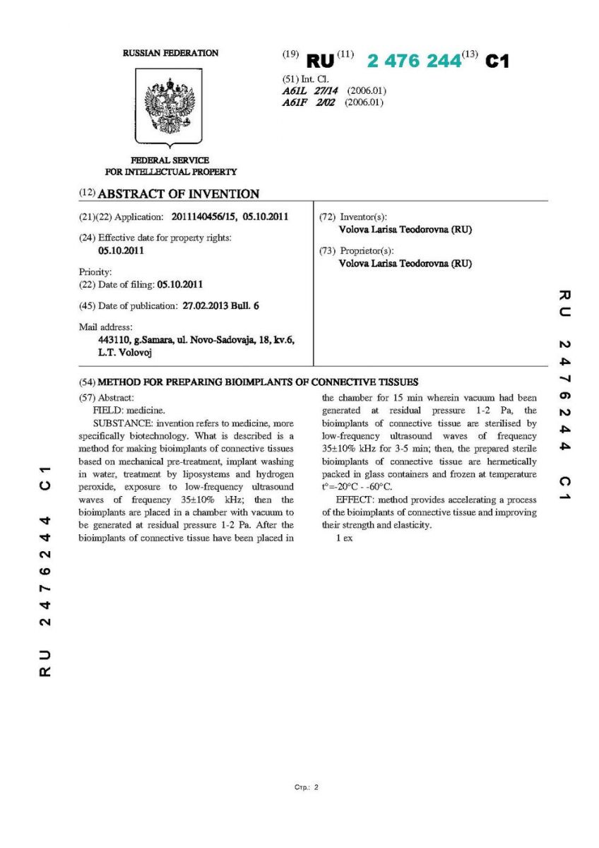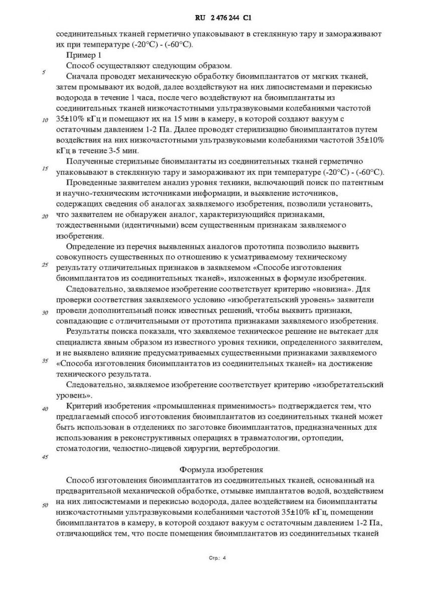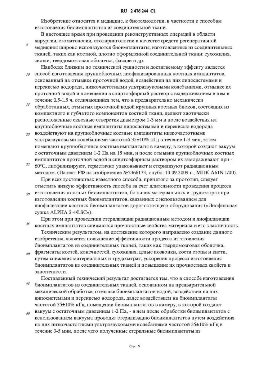 Способ изготовления биоимплантатов из соединительных тканей, основанный на предварительной механической обработке, отмывке имплантатов водой, воздействием на них липосистемами и перекисью водорода, далее воздействием на биоимплантаты низкочастотными ультразвуковыми колебаниями частотой 35±10% кГц, помещении биоимплантатов в камеру, в которой создают вакуум с остаточным давлением 1-2 Па, отличающийся тем, что после помещения биоимплантатов из соединительных тканей —Úð.: 4 CL 5 10 15 20 25 30 35 40 45 50 RU 2 476 244 C1 на 15 мин в камеру, в которой создают вакуум с остаточным давлением 1-2 Па, проводят стерилизацию биоимплантатов из соединительных тканей путем воздействия на них низкочастотными ультразвуковыми колебаниями частотой 35±10% кГц в течение 3-5 мин, затем полученные стерильные биоимплантаты из соединительных тканей герметично упаковывают в стеклянную тару и замораживают их при температуре t°=(-20)-(-60)ºC.